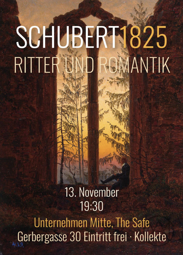 In diesem Konzert widmen wir uns Schuberts Vokal- und Klavierwerken aus dem Jahr 1825. Diese Kompositionen spiegeln den Geist der Romantik – die Sehnsucht nach einer anderen Welt und den Rückblick auf ein idealisiertes Mittelalter – wieder, inspiriert durch die Texte von Sir Walter Scott. Zu hören sind Auszüge aus The Lady of the Lake, die Klaviersonaten a-Moll D. 845 und D-Dur D. 850 sowie Lieder wie Abendrot, Totengräbers Heimweh und das berühmte Ave Maria.”