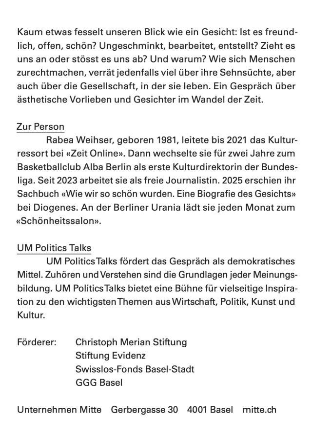 Rabea Weihser, geboren 1981, leitete bis 2021 das Kulturressort bei «Zeit Online». Dann wechselte sie für zwei Jahre zum Basketballclub Alba Berlin als erste Kulturdirektorin der Bundesliga. Seit 2023 arbeitet sie als freie Journalistin. 2025 erschien ihr Sachbuch «Wie wir so schön wurden. Eine Biografie des Gesichts» bei Diogenes. An der Berliner Urania lädt sie jeden Monat zum «Schönheitssalon».