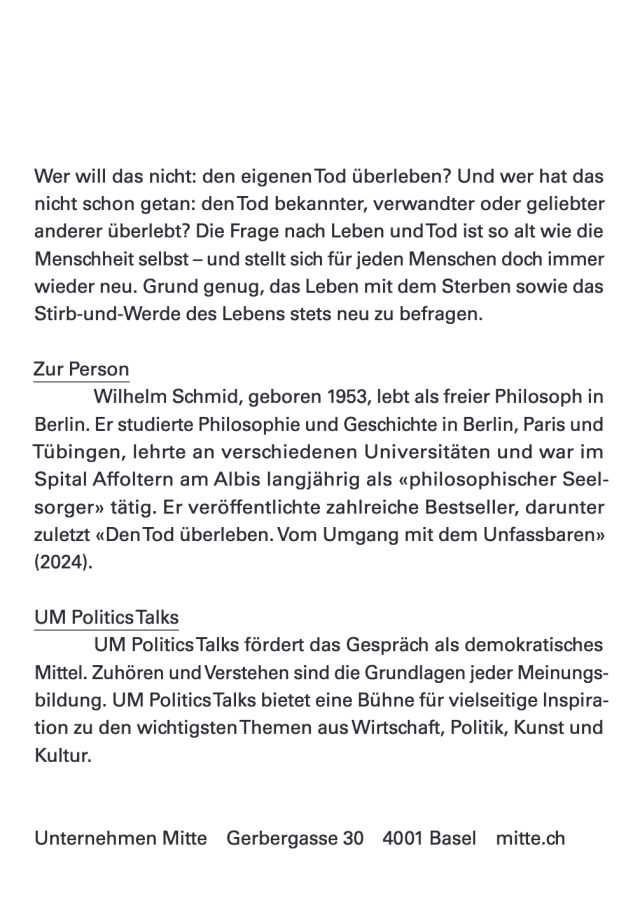 Wilhelm Schmid, geboren 1953, lebt als freier Philosoph in Berlin. Er studierte Philosophie und Geschichte in Berlin, Paris und Tübingen, lehrte an verschiedenen Universitäten und war im Spital Affoltern am Albis langjährig als «philosophischer Seelsorger» tätig. Er veröffentlichte zahlreiche Bestseller, darunter zuletzt «Den Tod überleben. Vom Umgang mit dem Unfassbaren» (2024).