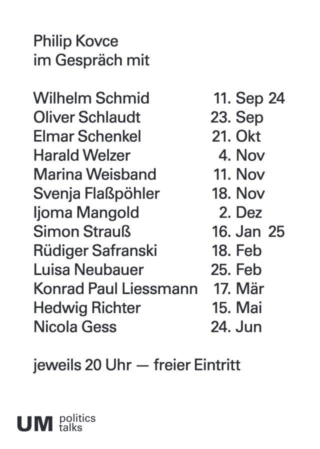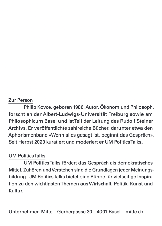 UM Politics Talks fördert das Gespräch als demokratisches Mittel. Zuhören und Verstehen sind die Grundlagen jeder Meinungsbildung. UM Politics Talks bietet eine Bühne für vielseitige Inspiration zu den wichtigsten Themen aus Wirtschaft, Politik, Kunst und Kultur.