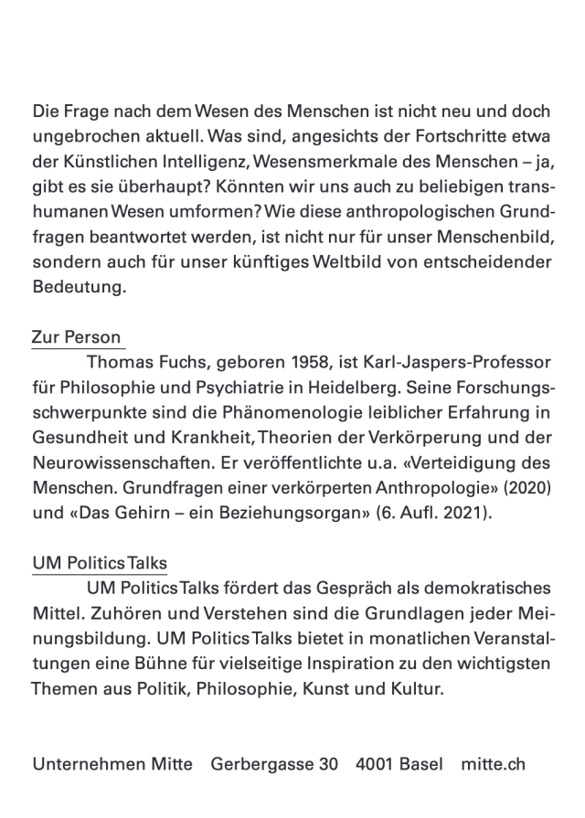 Thomas Fuchs, geboren 1958, ist Karl-Jaspers-Professor für Philosophie und Psychiatrie in Heidelberg. Seine Forschungsschwerpunkte sind die Phänomenologie leiblicher Erfahrung in Gesundheit und Krankheit, Theorien der Verkörperung und der Neurowissenschaften. Er veröffentlichte u.a. «Verteidigung des Menschen. Grundfragen einer verkörperten Anthropologie» (2020) und «Das Gehirn – ein Beziehungsorgan» (6. Aufl. 2021).